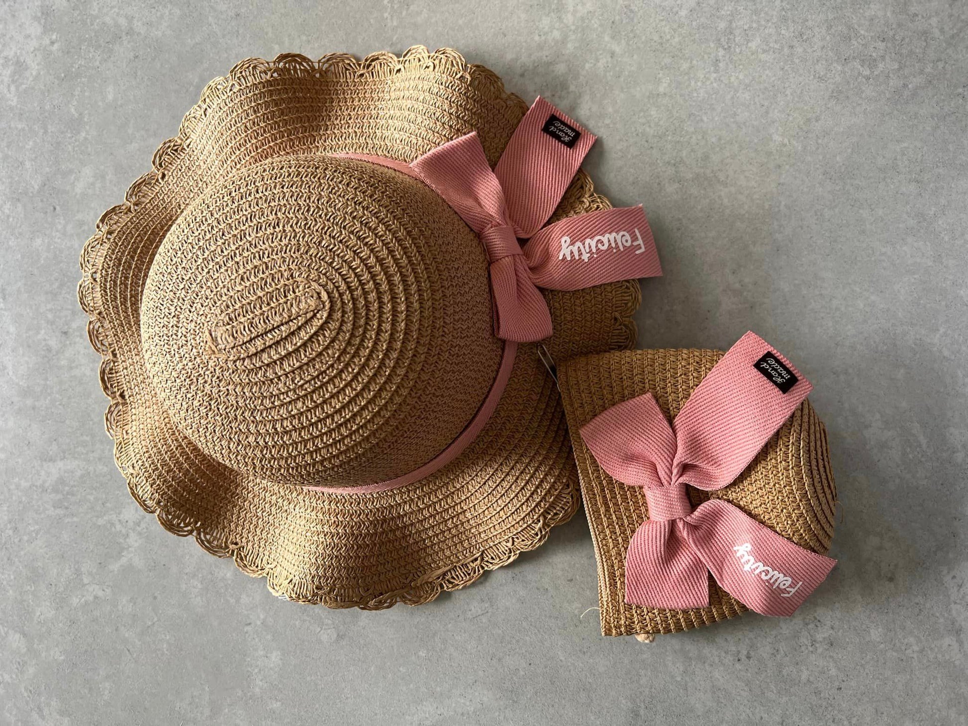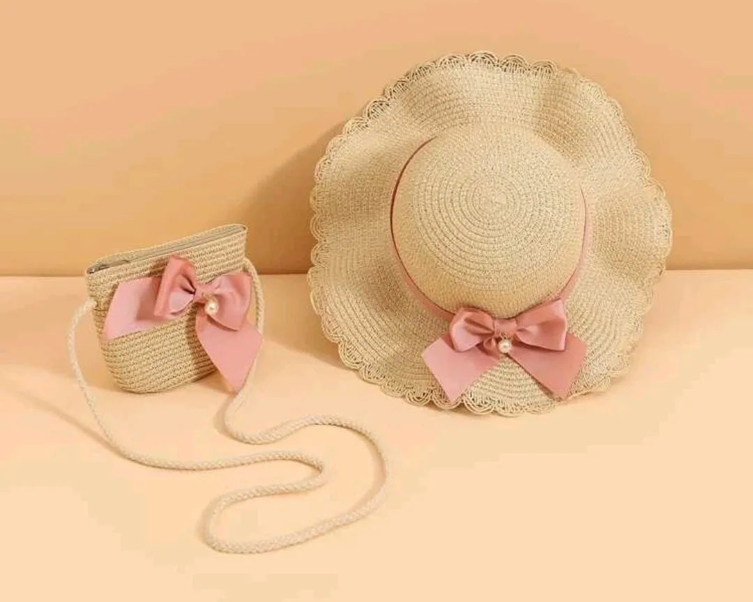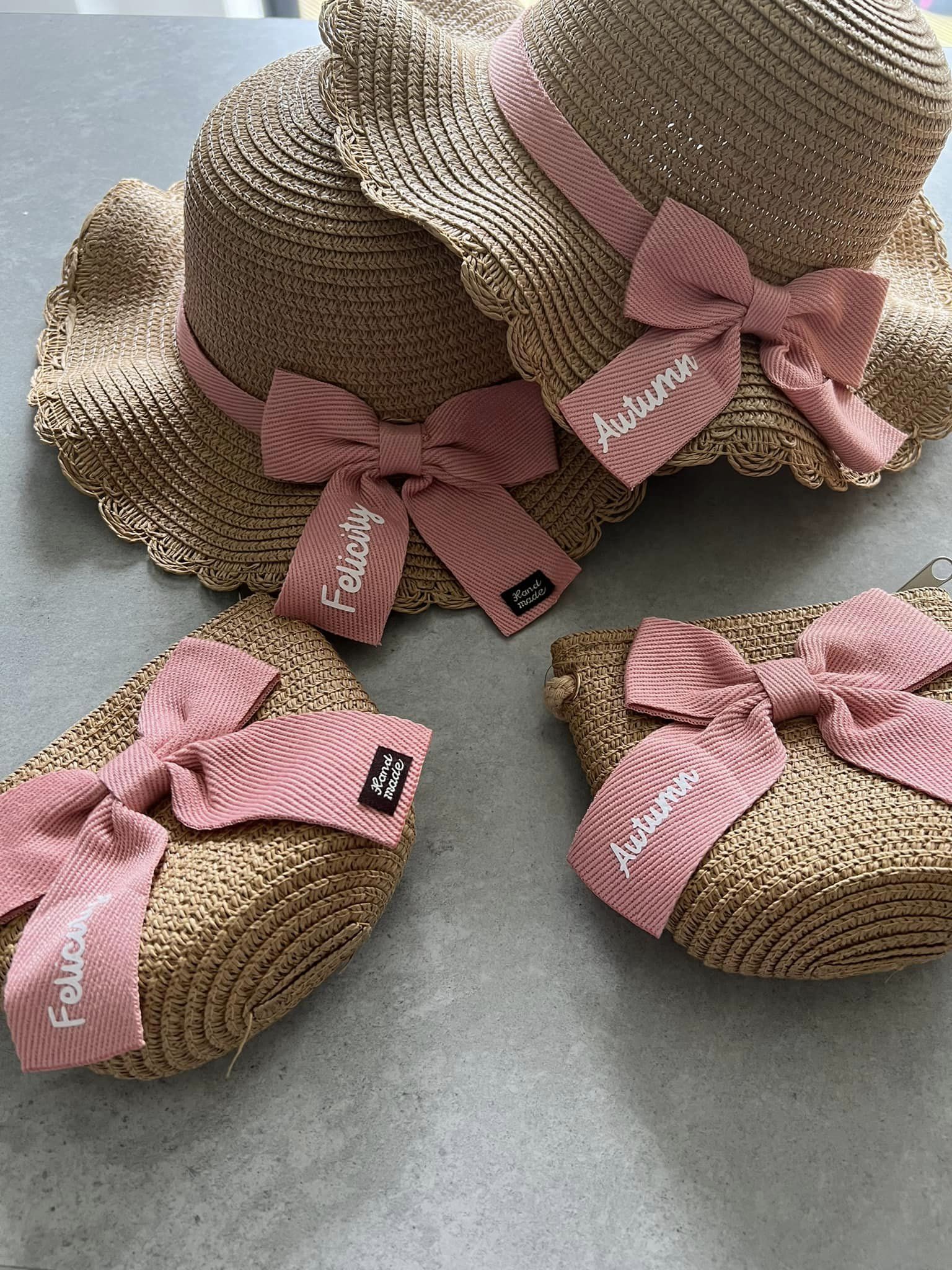 Matching straw hats (50-53cm) with bag with pink bow and pearl attached.
