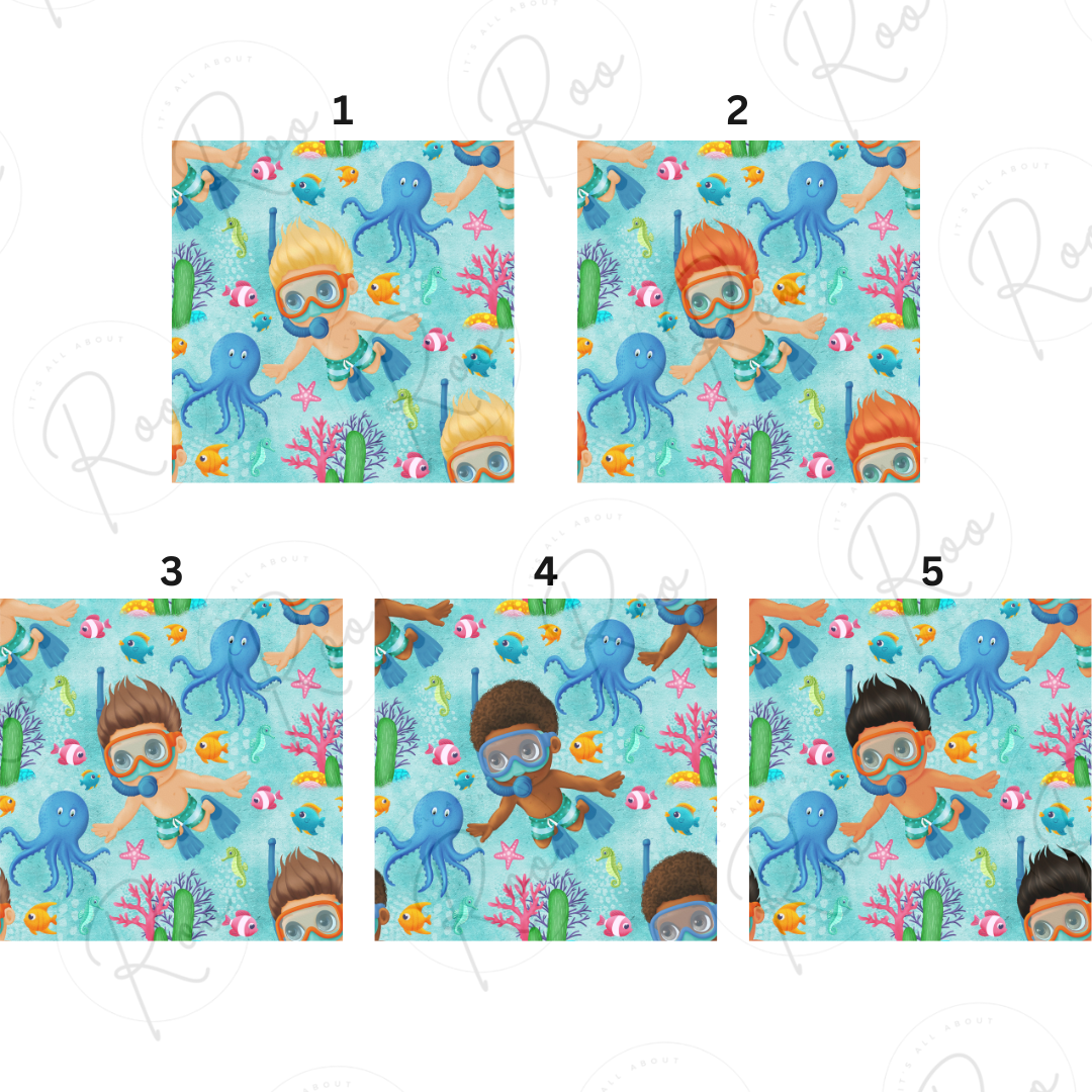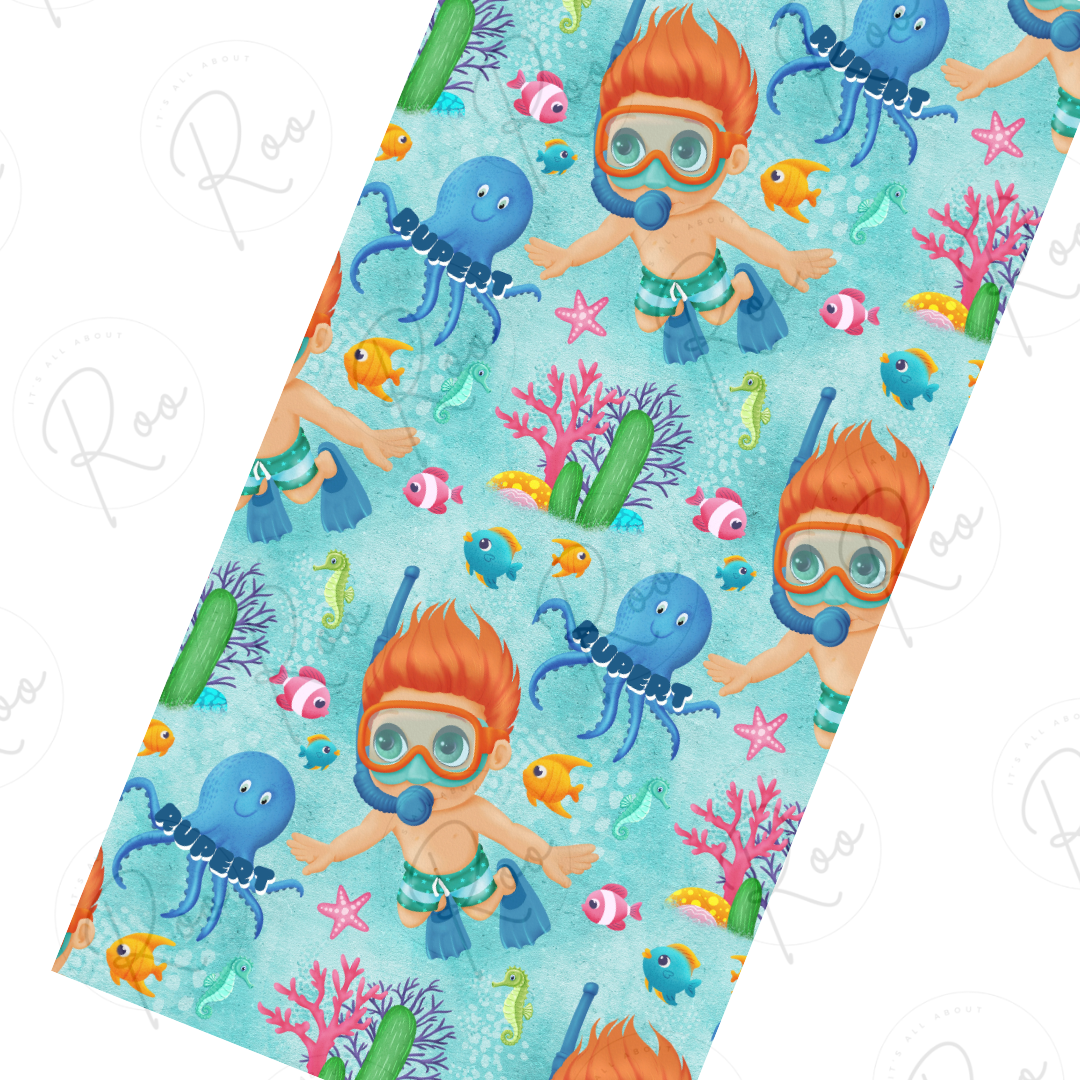What a way to make your mark on holiday with our underwater boy beach towel. The continuous design has an underwater character (5 design choices to choose from), coral, fish and an octopus with your name!