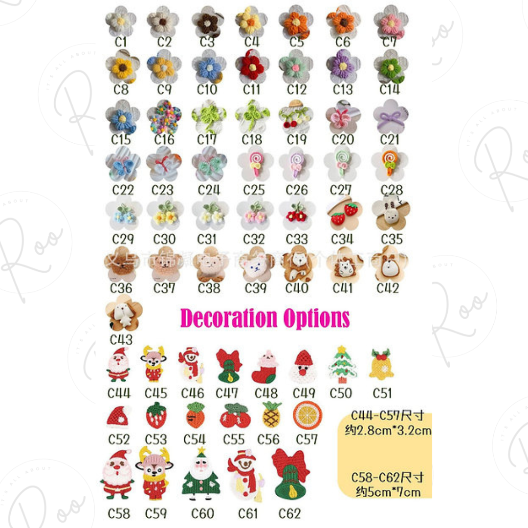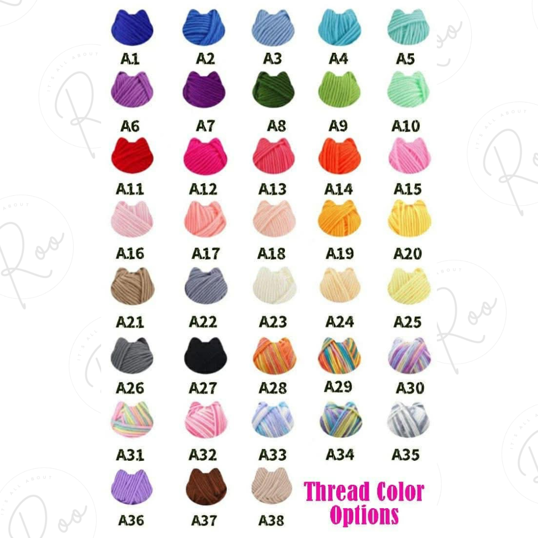 *please click on images to see full range of colours and decorations available and please note the thread and decoration code numbers are UNDER the image for example C1 is a daisy with yellow center, A1 is royal blue
