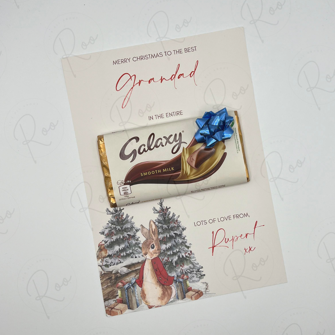 Recipients name/title and givers name personalised. Comes complete with 100g bar of galaxy milk chocolate.