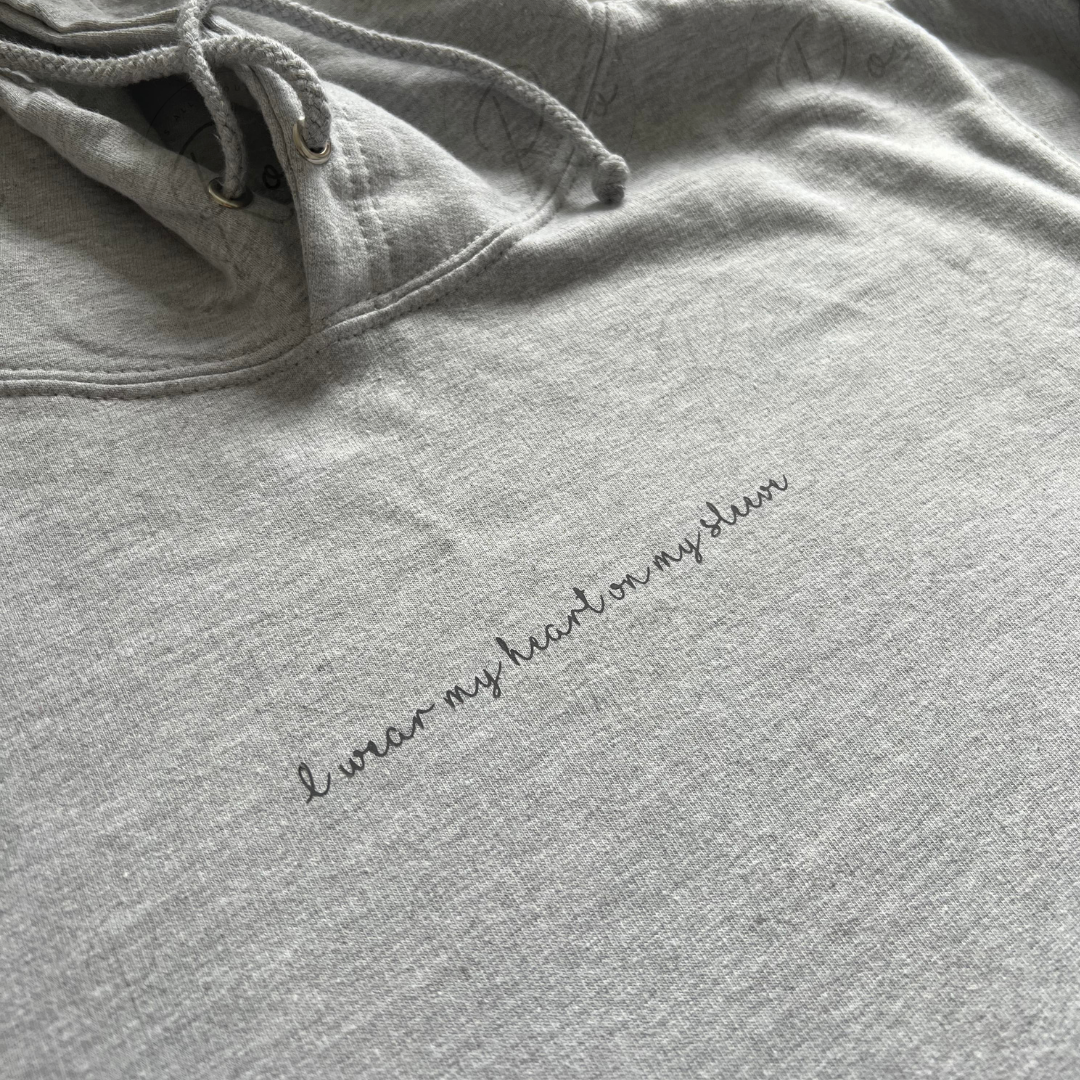 - "I wear my heart on my sleeve" text on centre of hoodie