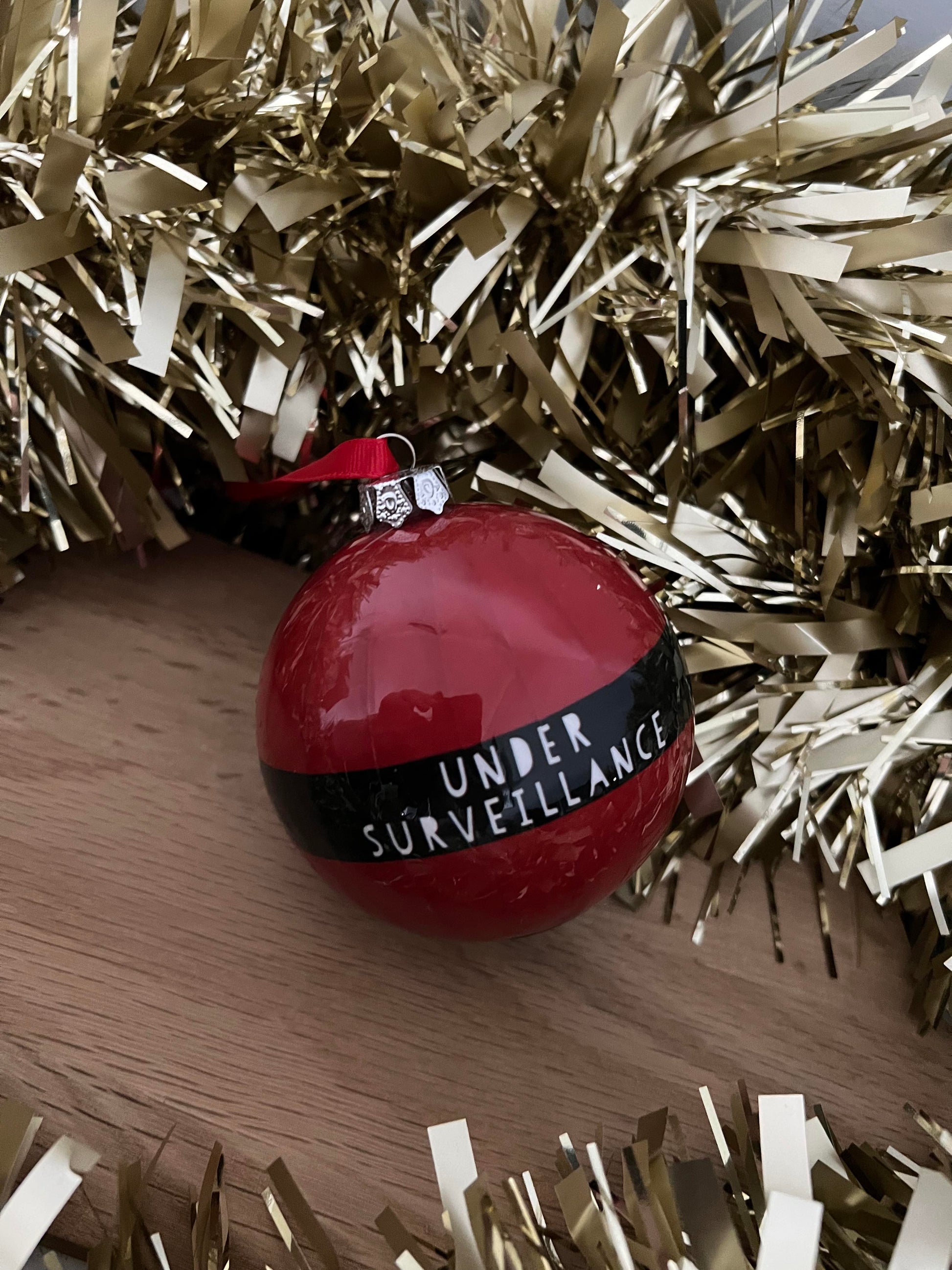 Each bauble features a camera print with a red flashing LED light to resemble a real security camera.
