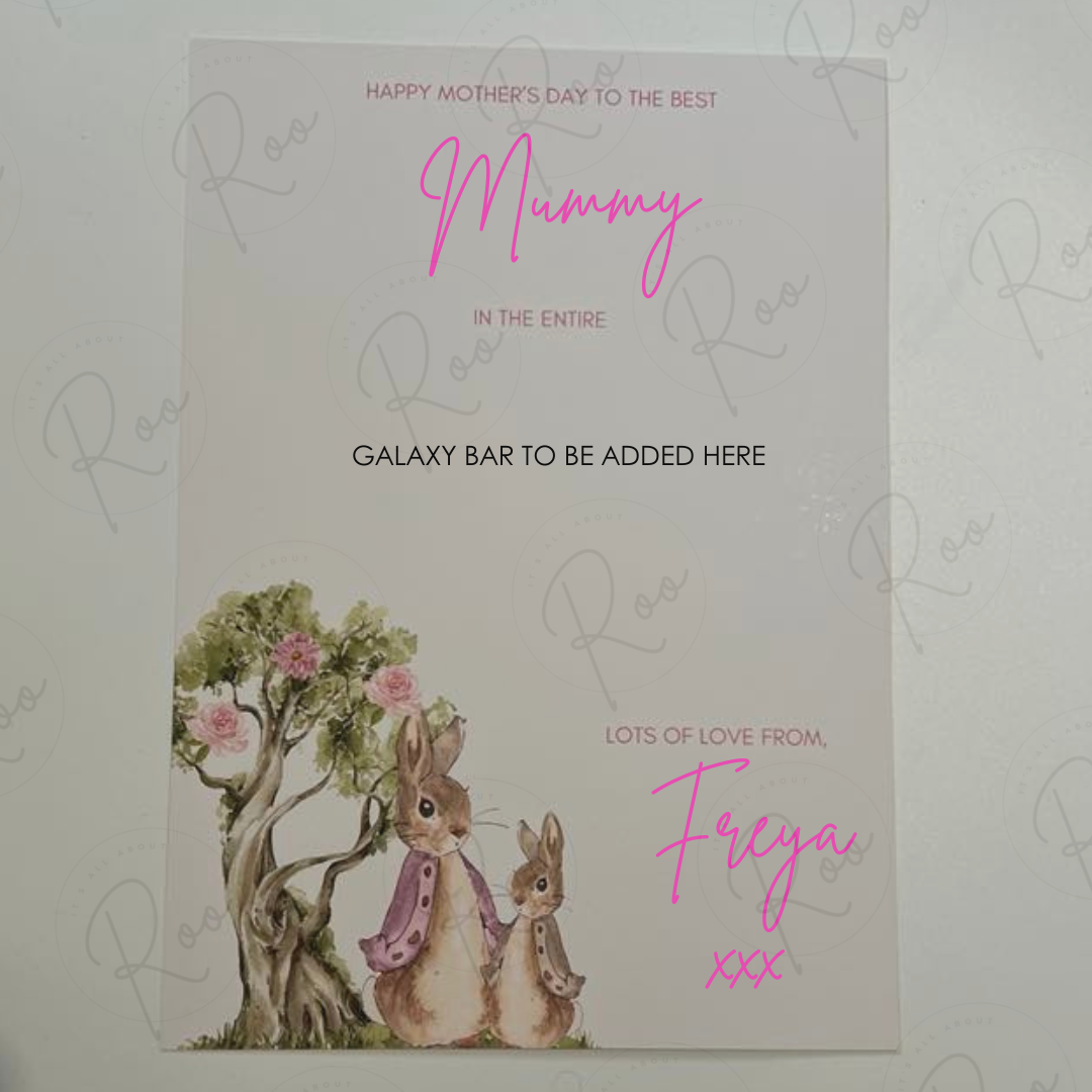 Recipients name/title and givers name personalised. Comes complete with 100g bar of galaxy milk chocolate.